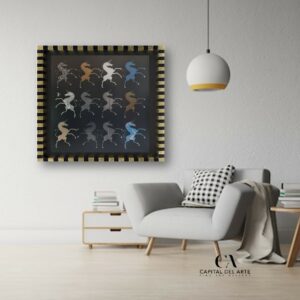 La obra del maestro Pedro Friedeberg nos transporta a un universo donde las aves se despliegan como metáforas de libertad y trascendencia. En un fondo oscuro y profundo, las aves se alzan en un contraste de tonos metálicos (plata, oro, beige, blanco y negro) como destellos de luz que cortan la oscuridad, invitándonos a reflexionar sobre el paso del tiempo y la lucha por la belleza en un mundo moderno.