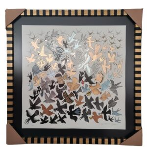 En esta delicada obra gráfica de Pedro Friedeberg, las aves se despliegan como símbolos de libertad y elegancia, surcando el aire con gracia etérea. Sobre un fondo blanco que evoca la pureza y la calma, los tonos metálicos de plata, oro, beige, blanco y negro crean una danza visual que trasciende el espacio. Cada ave, en su forma estilizada y dinámica, captura la esencia misma de la ligereza, flotando entre la realidad y el sueño.