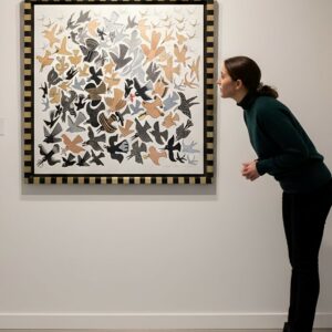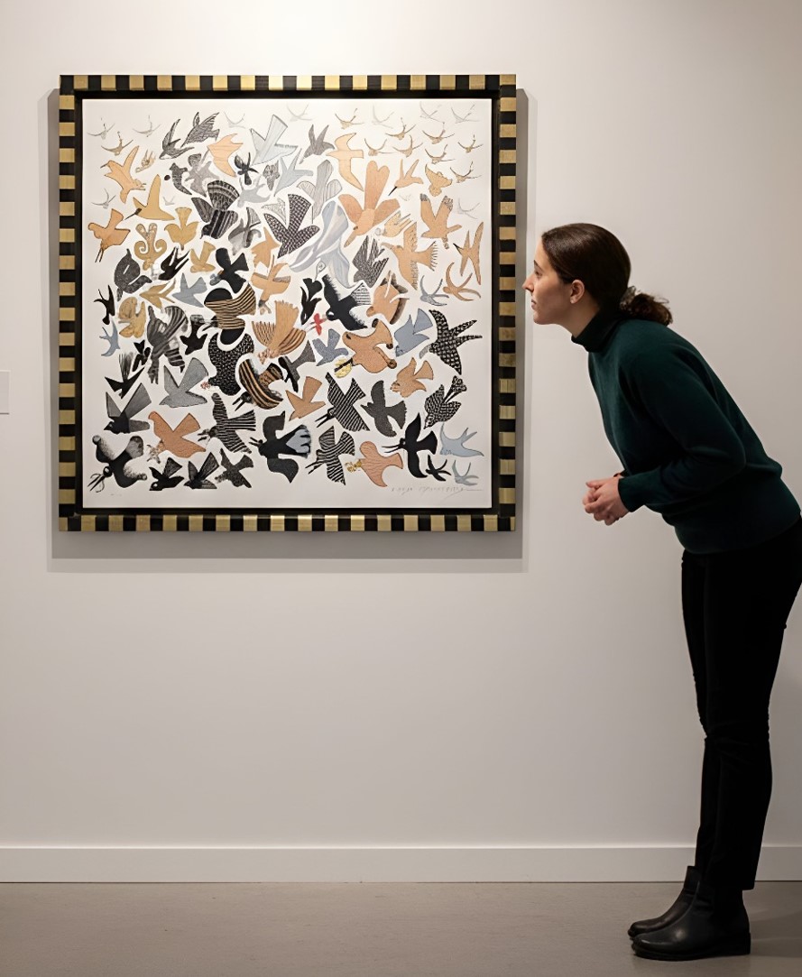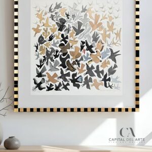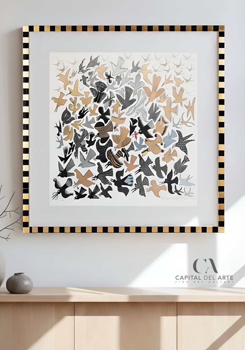 En esta delicada obra gráfica de Pedro Friedeberg, las aves se despliegan como símbolos de libertad y elegancia, surcando el aire con gracia etérea. Sobre un fondo blanco que evoca la pureza y la calma, los tonos metálicos de plata, oro, beige, blanco y negro crean una danza visual que trasciende el espacio. Cada ave, en su forma estilizada y dinámica, captura la esencia misma de la ligereza, flotando entre la realidad y el sueño.